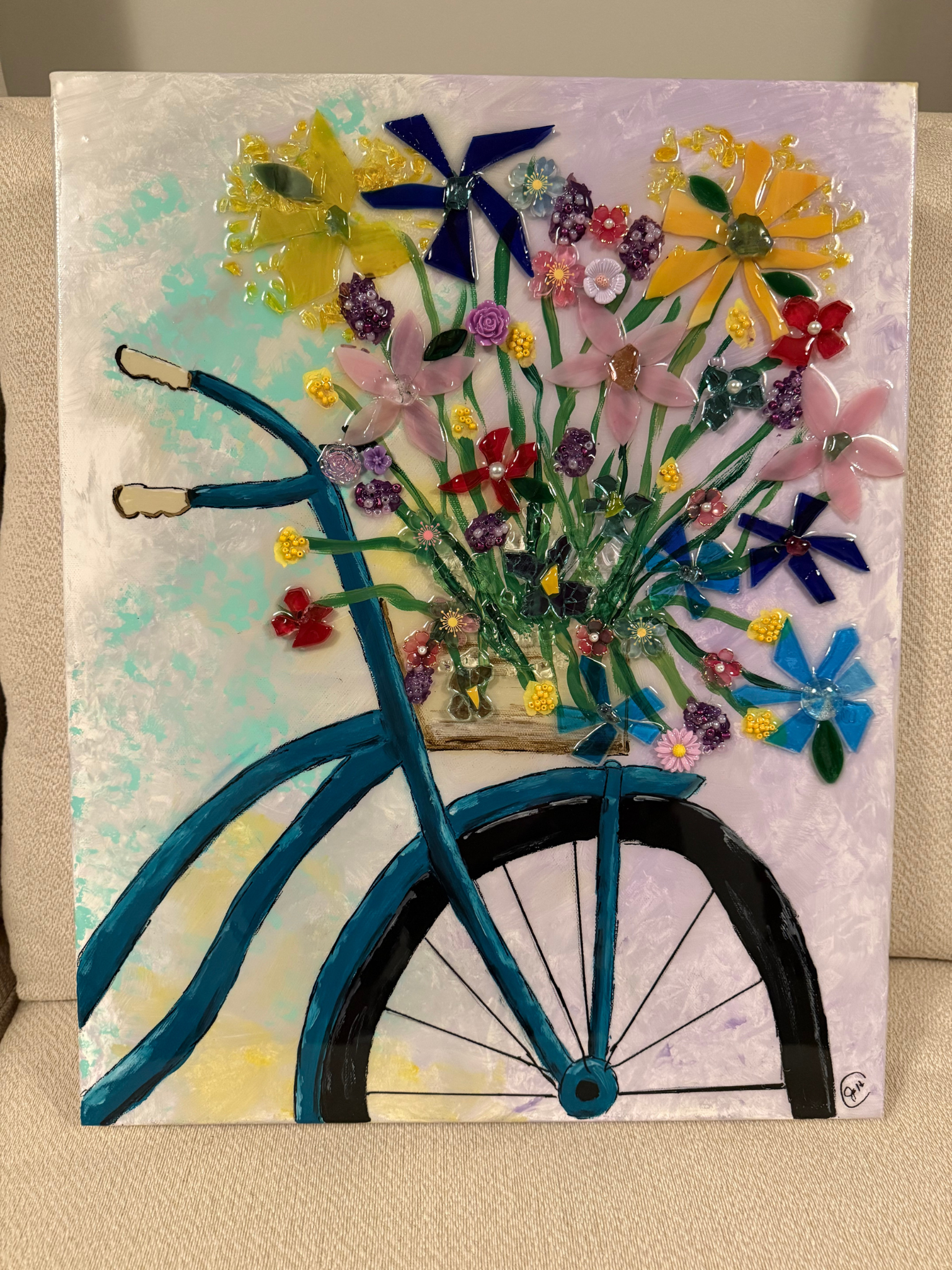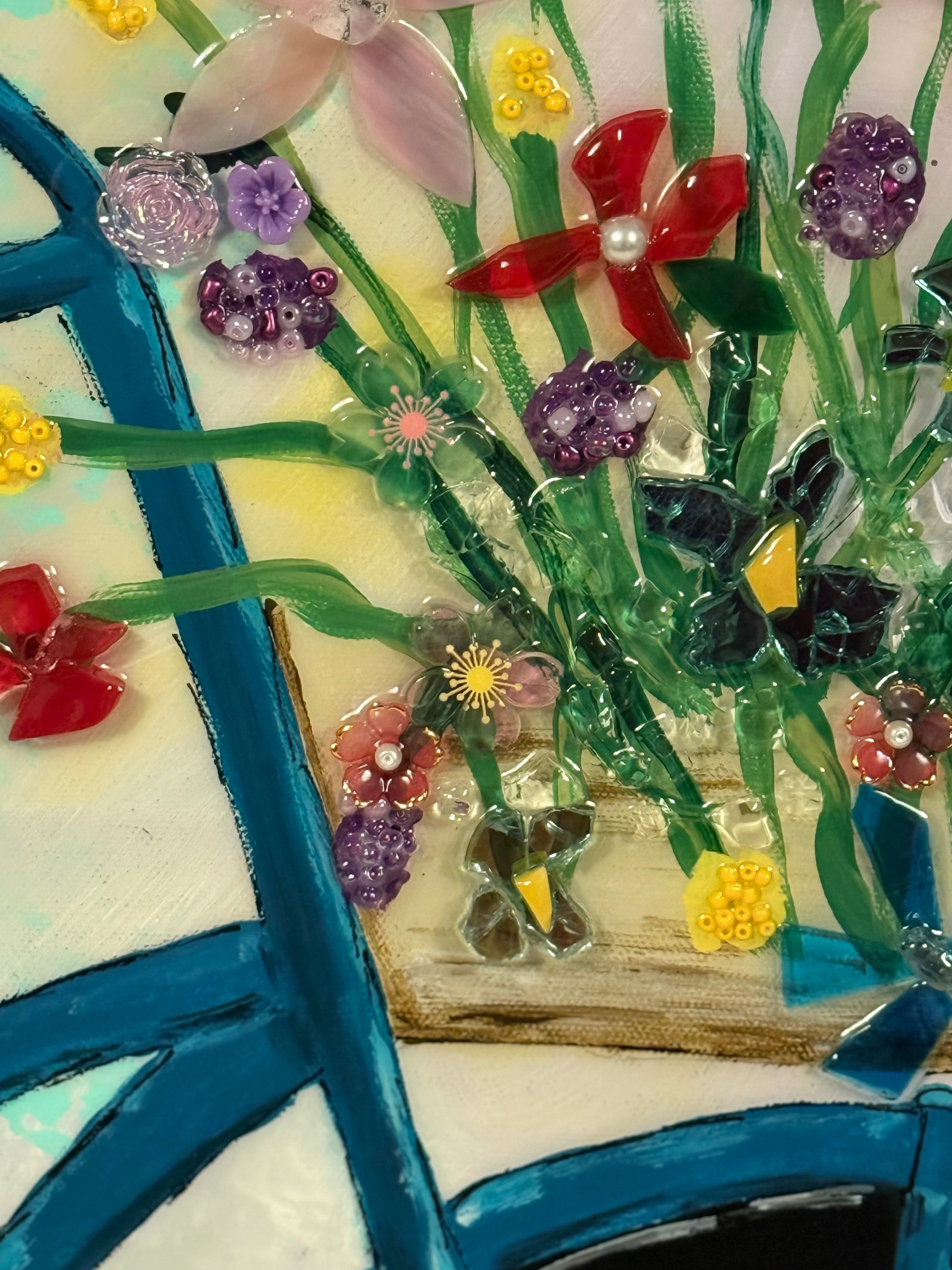 Beautiful and colorful acrylic painting on a16x20 gallery wrapped canvas and embellished with glass and other 3D enhancements. Finished in resin.