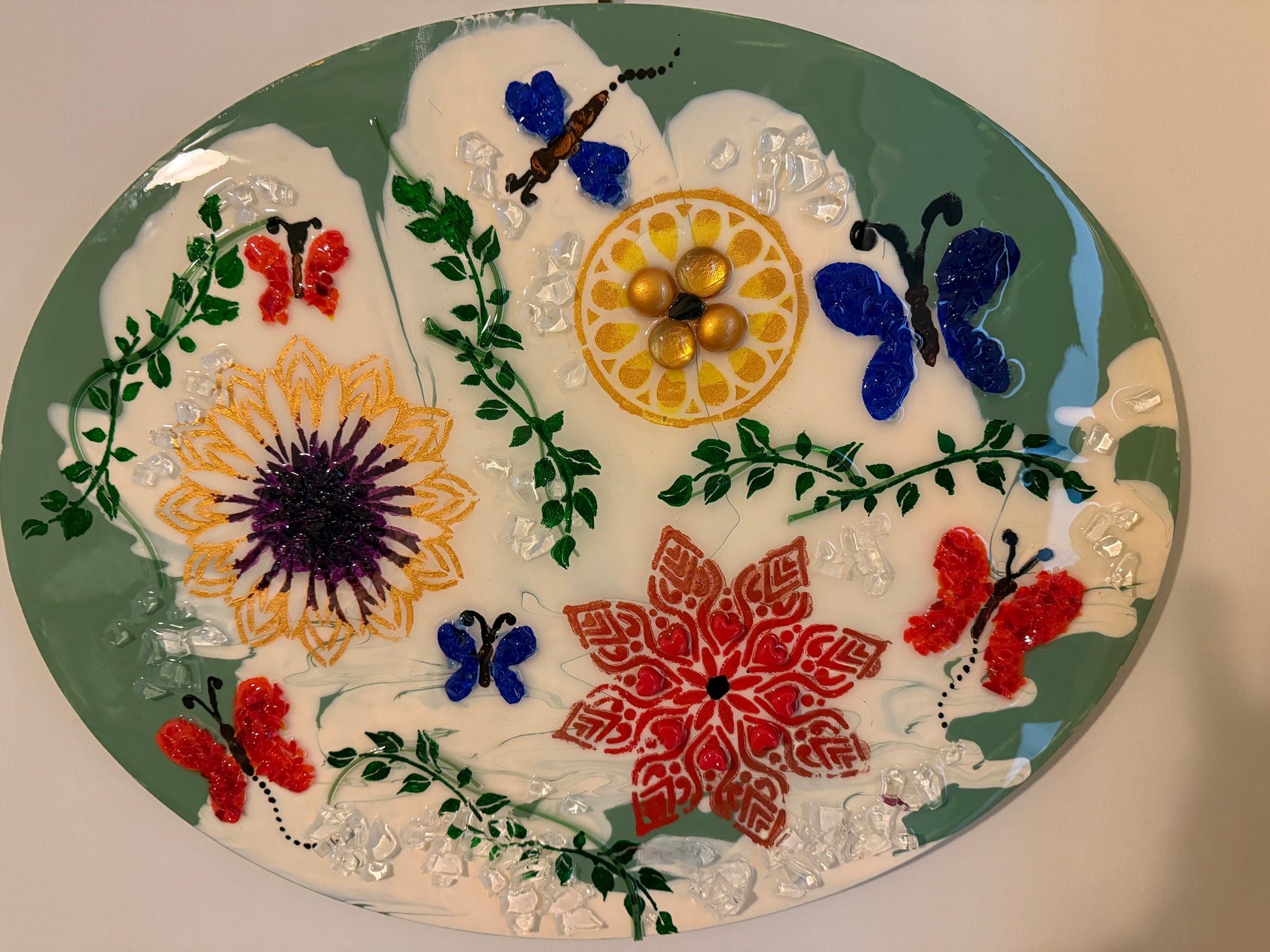 Fresh display of flowers, greenery, butterflies, and dragonfly adorn this 16x20x.75 oval canvas. Stenciled and painted over an acrylic paint poured base and embellished with glass, vitrigraph, and seed beads and finished in resin.