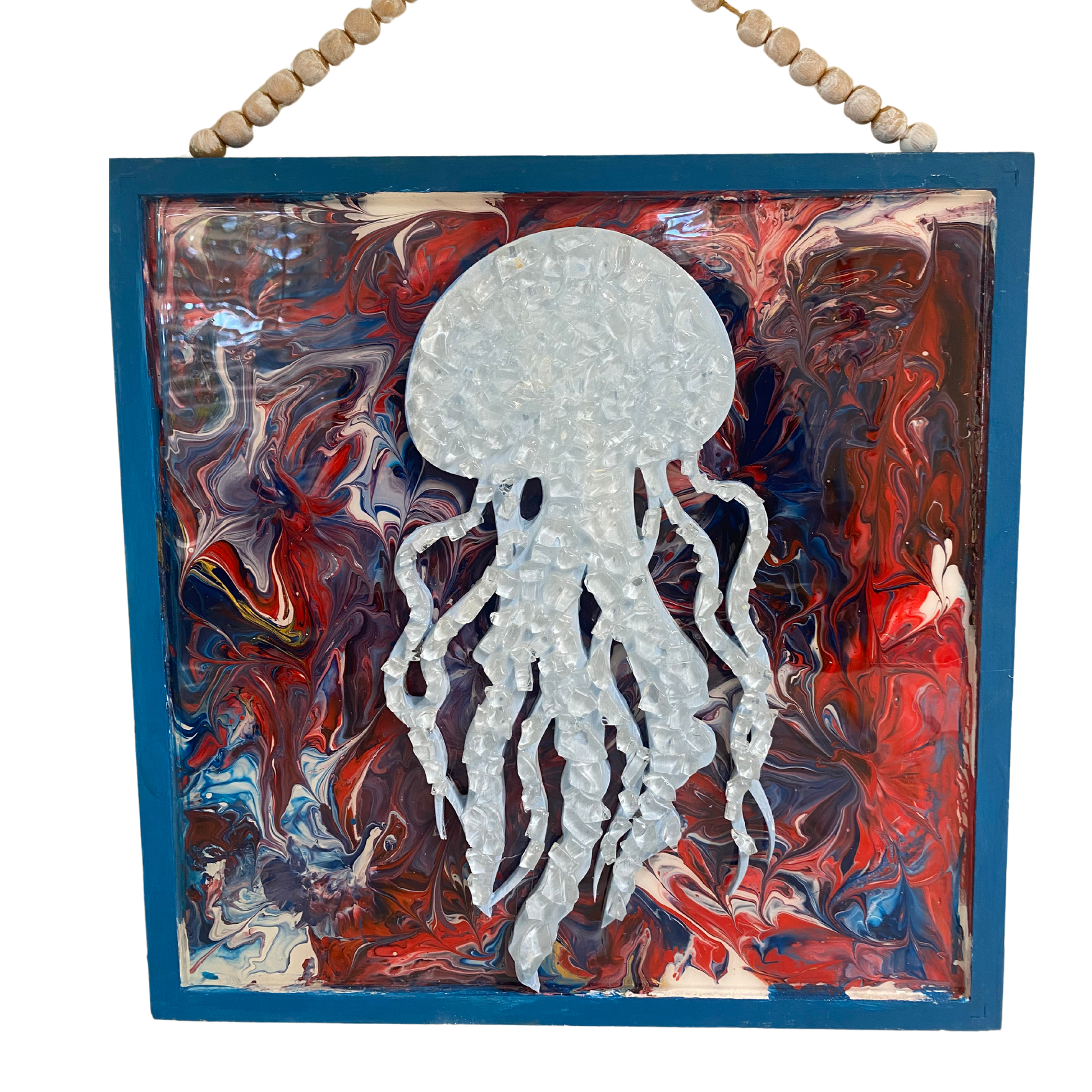 Wooden painted octopus embellished with cut glass and placed over a fluid art (paint poured) wooden panel finished in resin. Ready to hang. 14x14